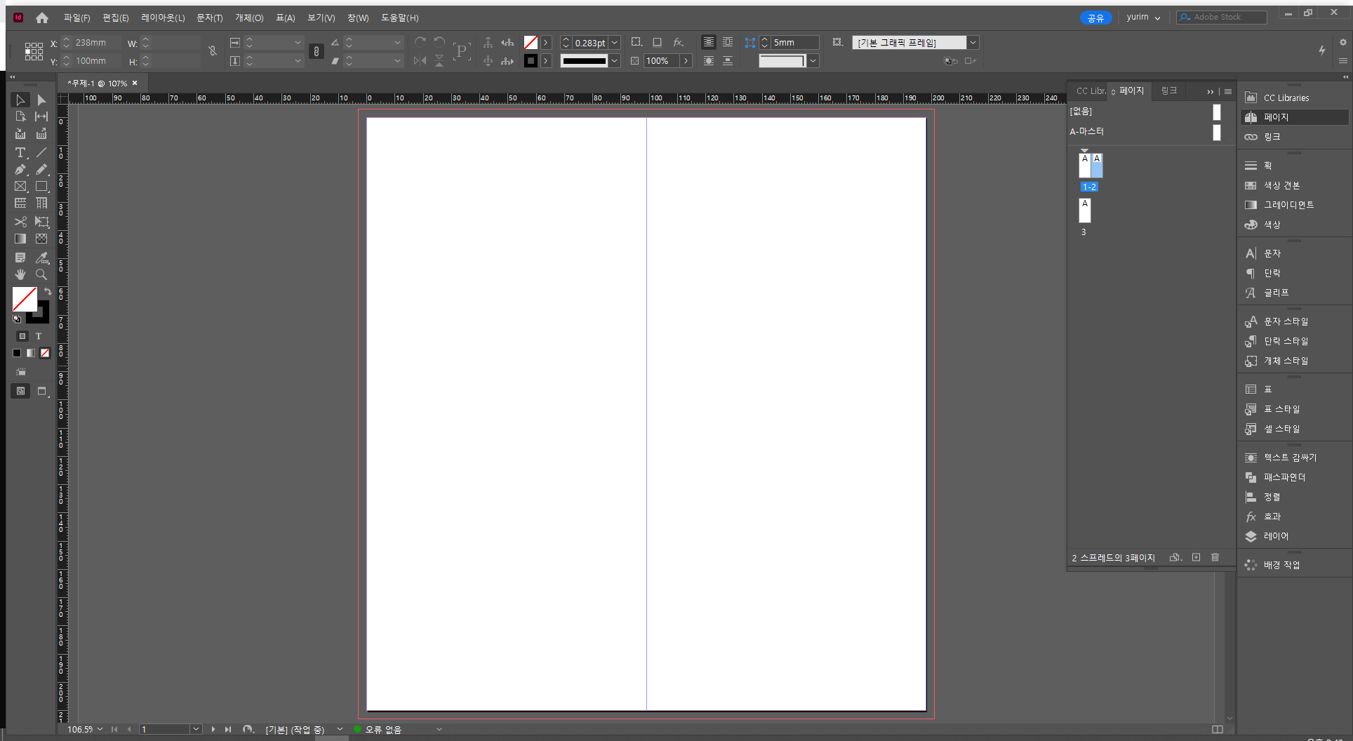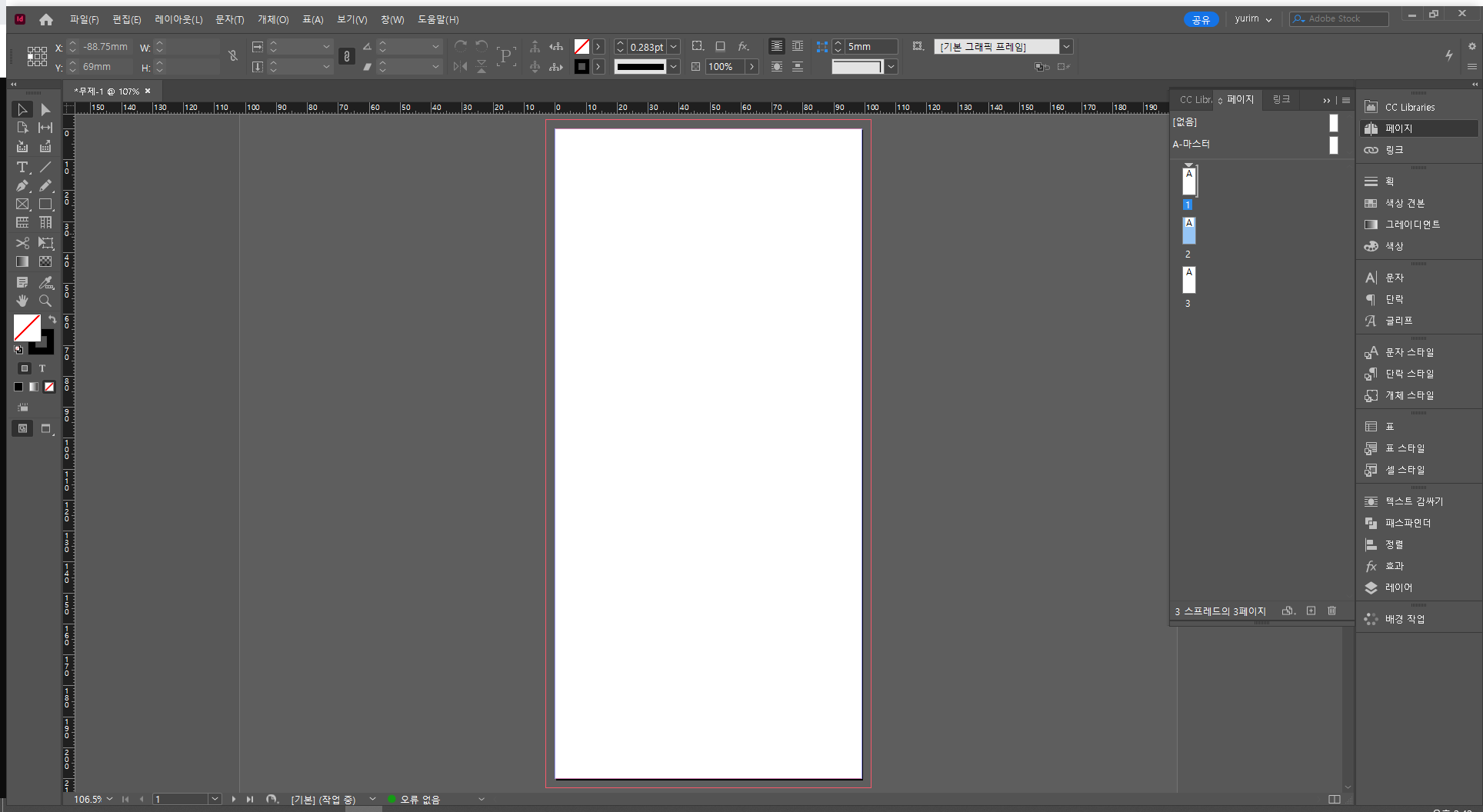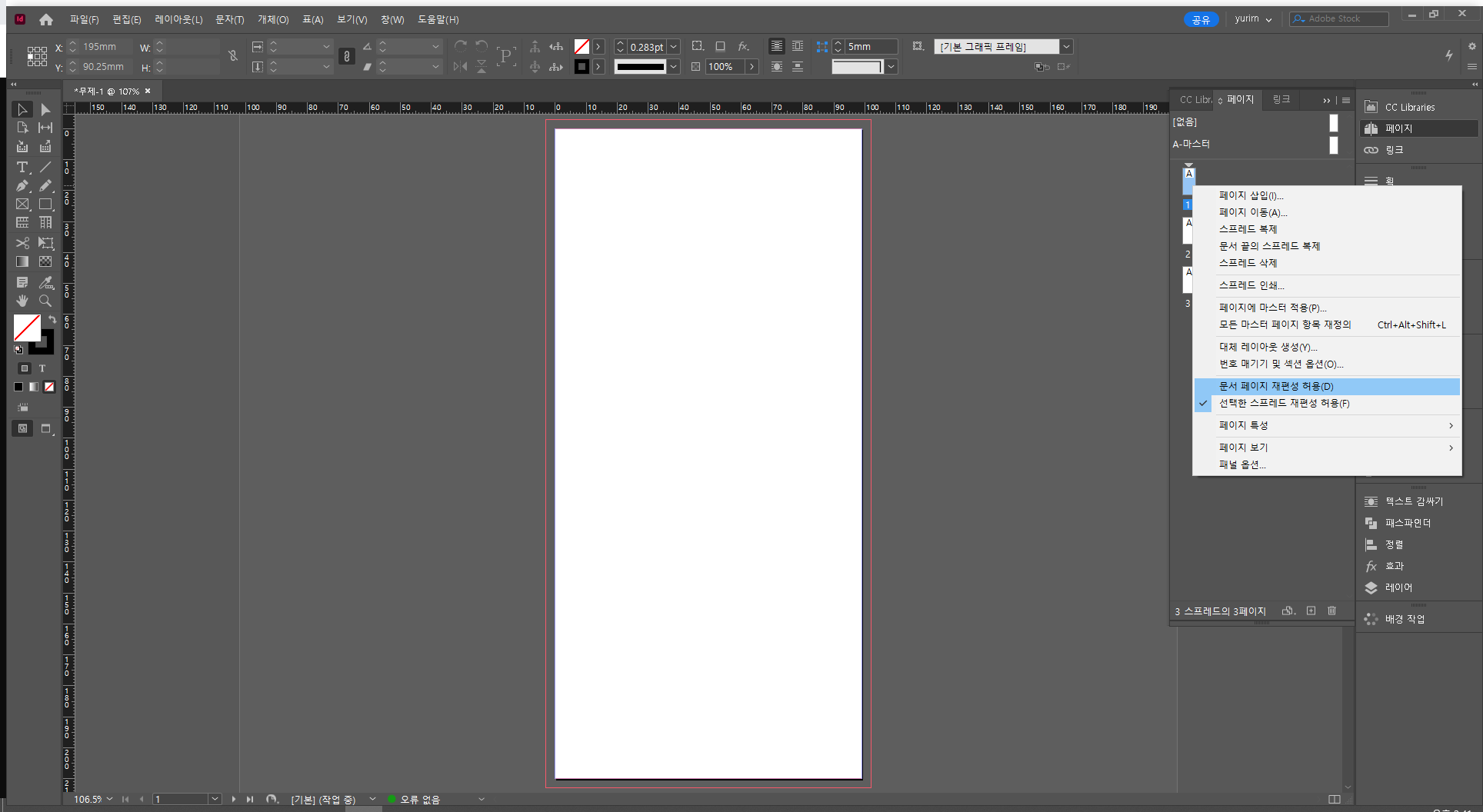 2. 페이지 패널 - 우클릭 - 문서 페이지 재편성 허용 체크 풀기 - 페이지 위로 갖다붙이면 3단 구성됨